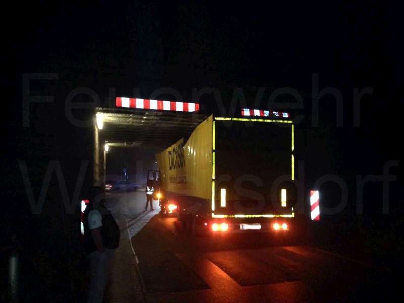 Technische Hilfe "LKW in Bahnunterführung" In der Bahnunterführung der Deggendorfer Straße in Wallersdorf war ein LKW stecken geblieben weil dessen Aufbau für die Unterführung zu hoch war. |